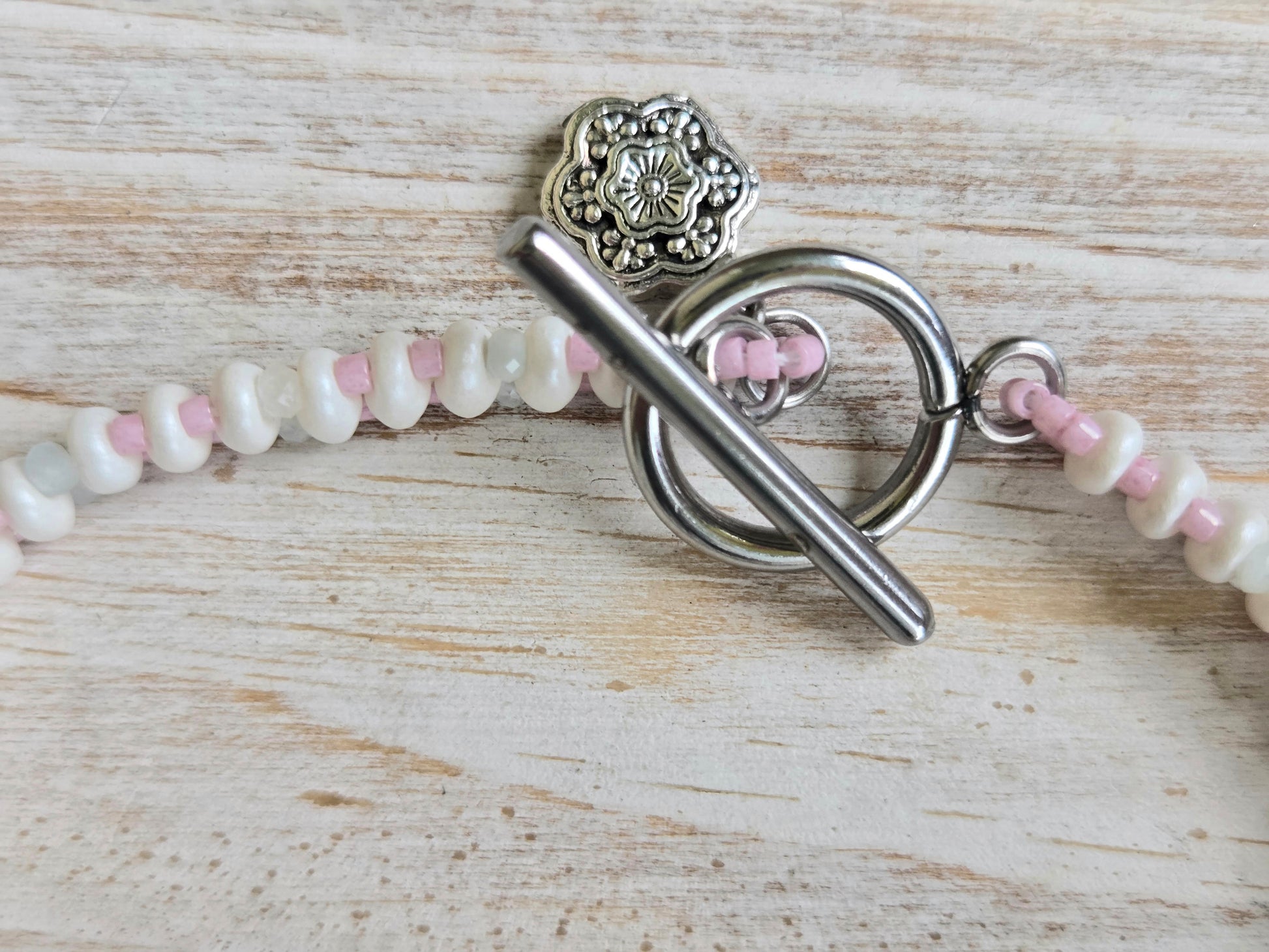 Measures 7.5" with ant silver plated toggle clasp