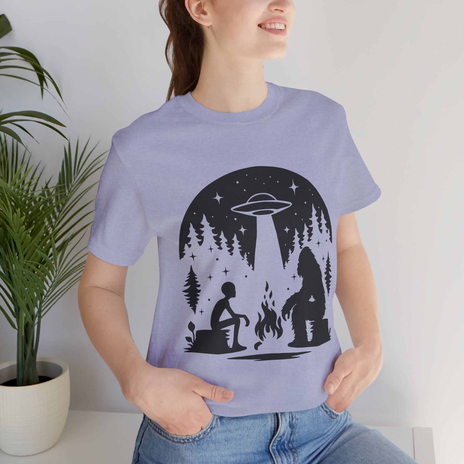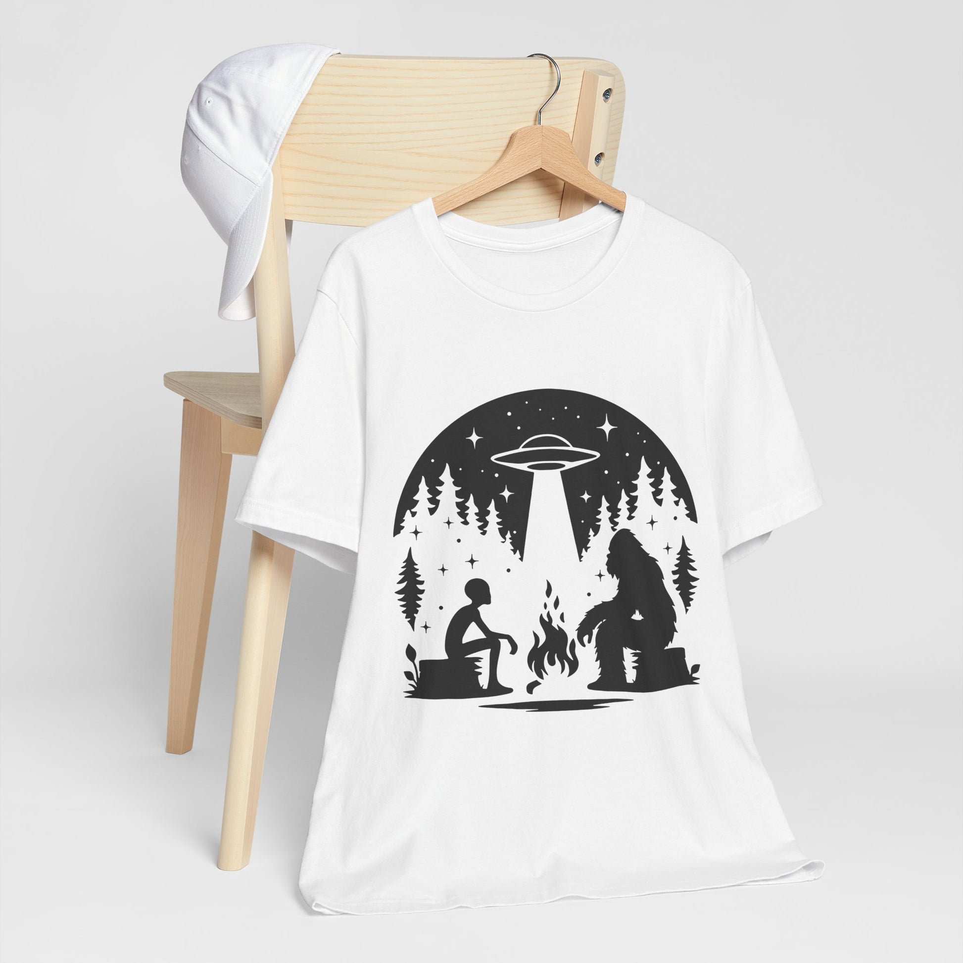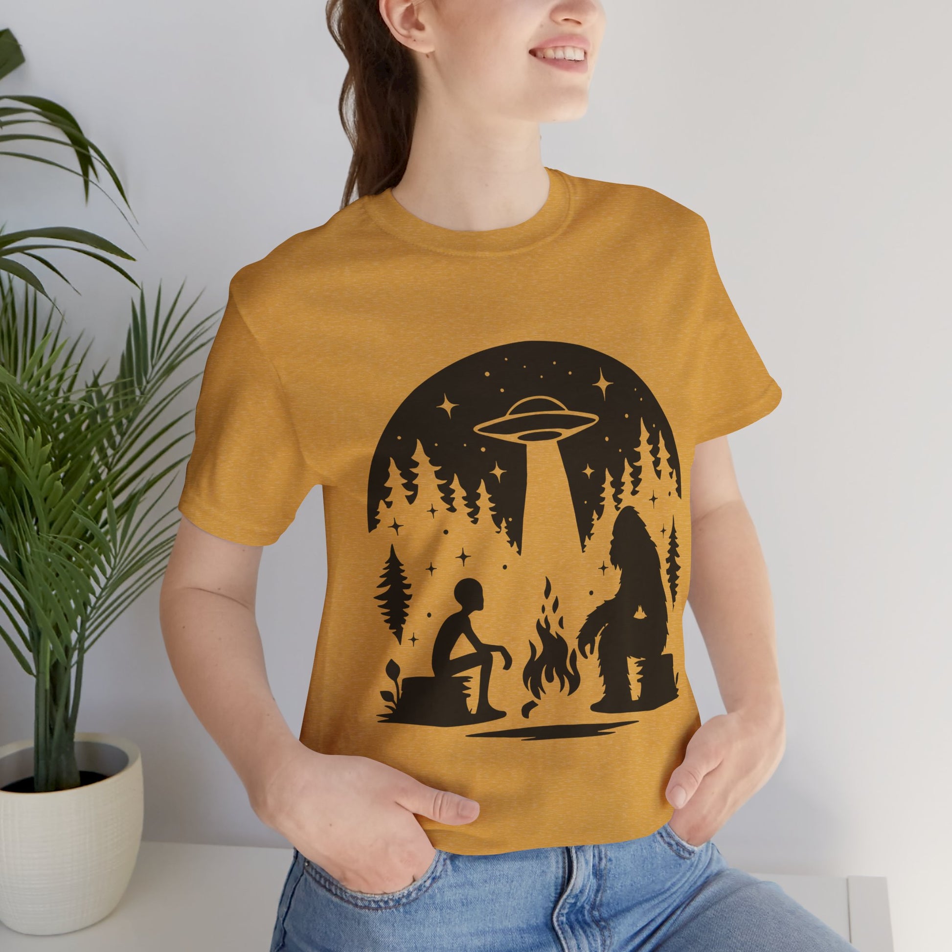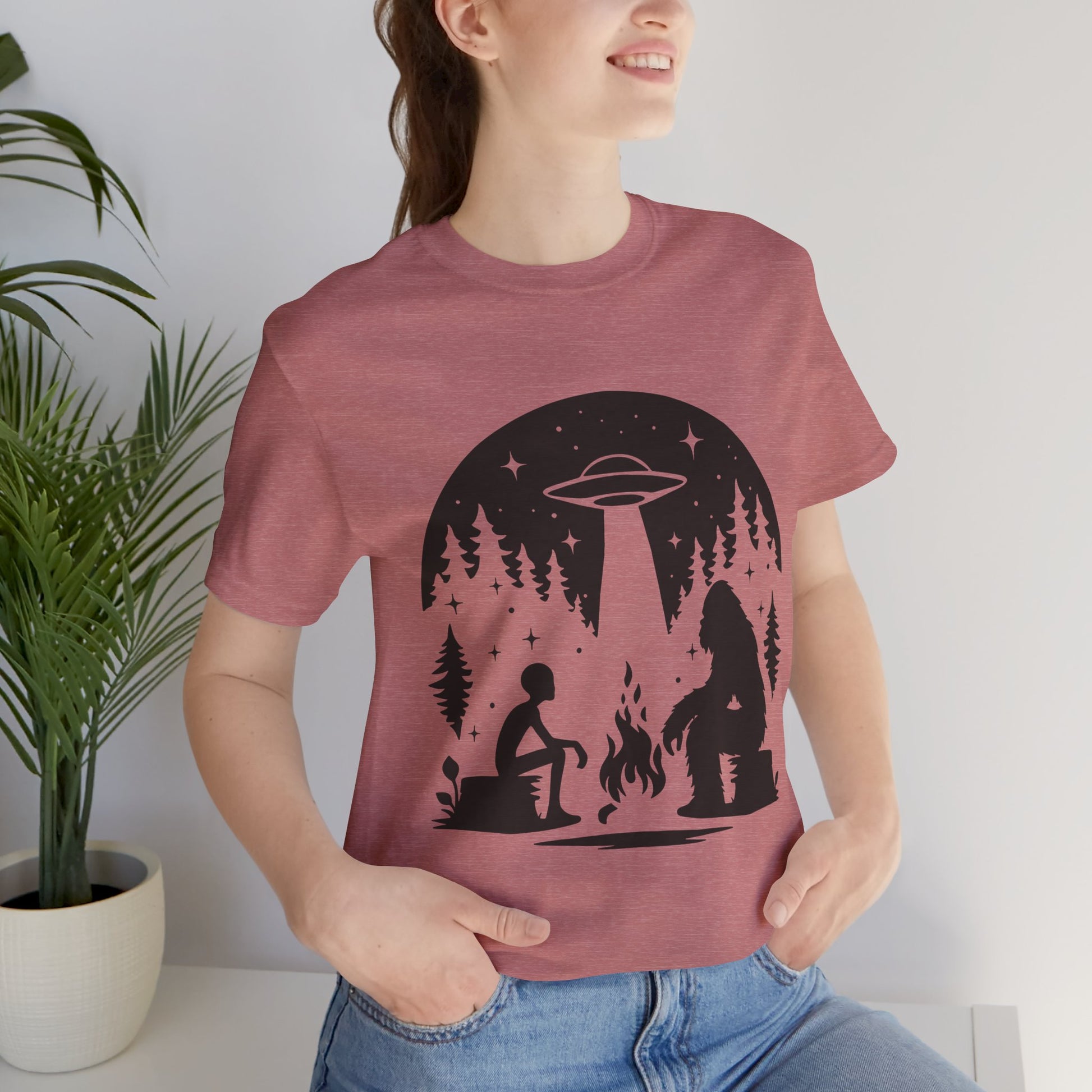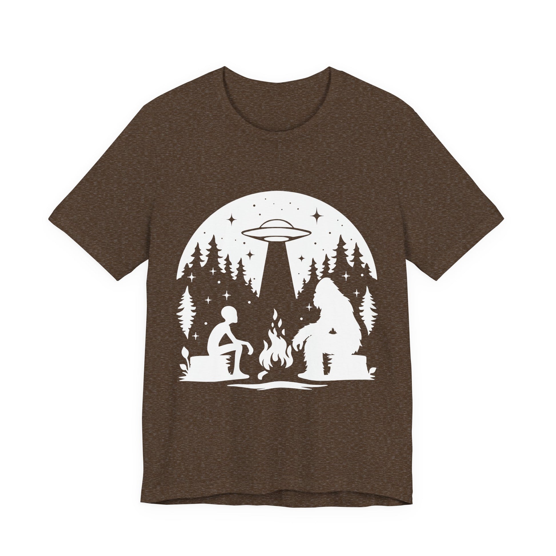 Camping Alien & Bigfoot Unisex Tee, Fun Outdoor Adventure Shirt, Gift for Nature Lovers, Unique Graphic T-Shirt, Summer Camp Outfit