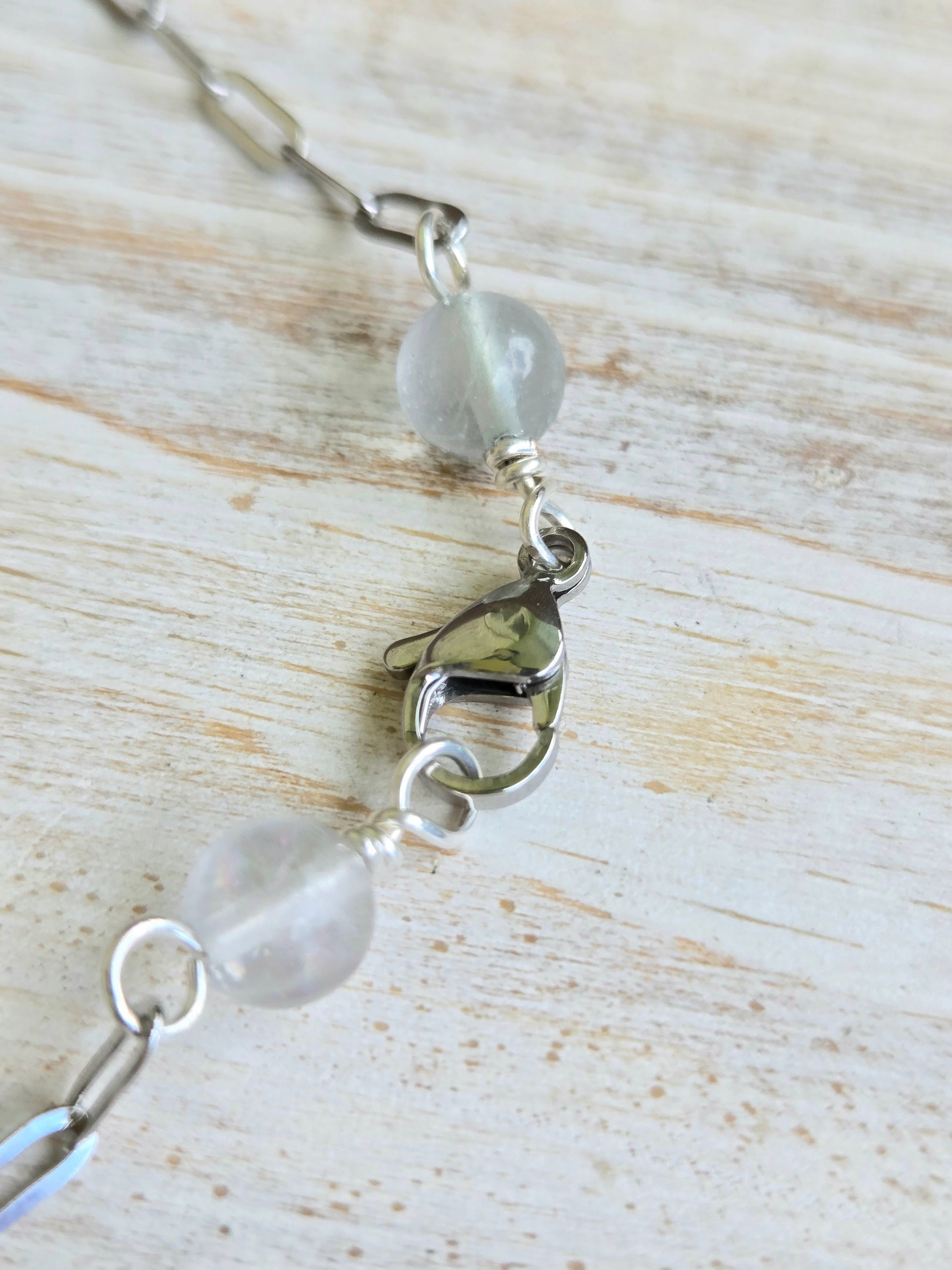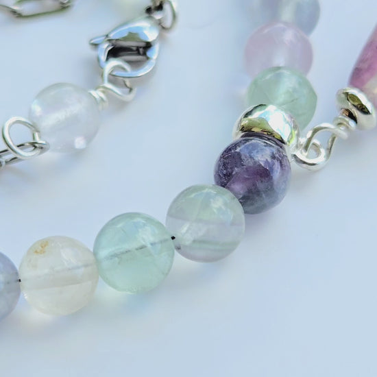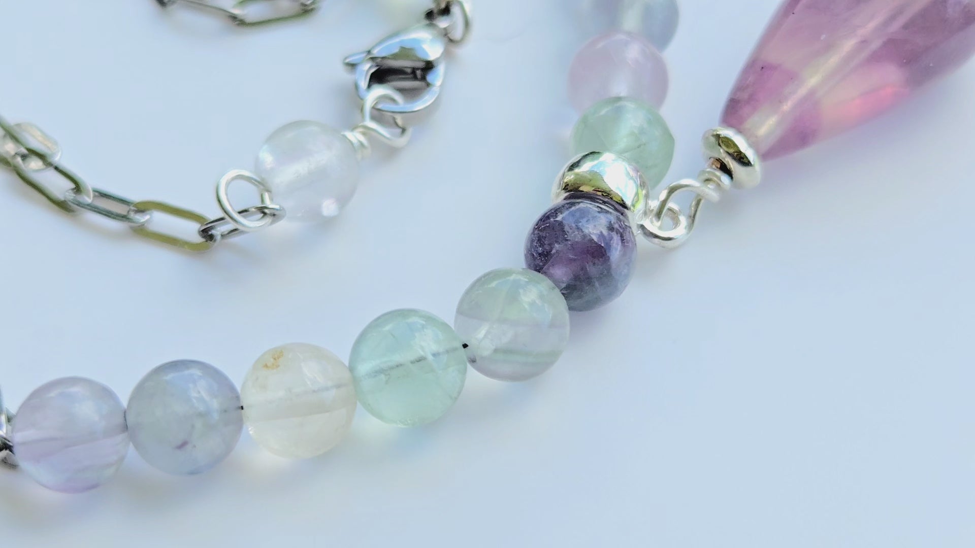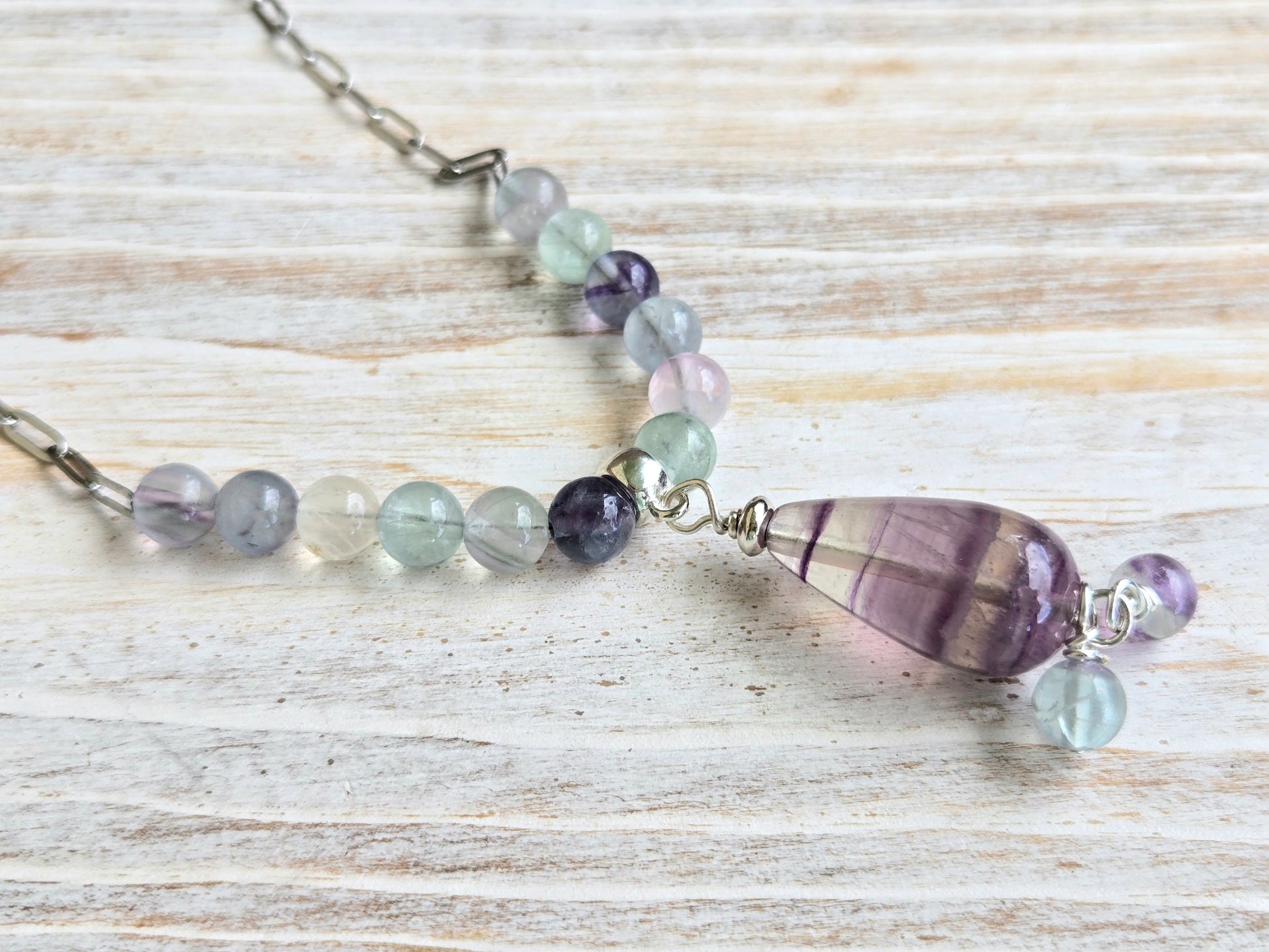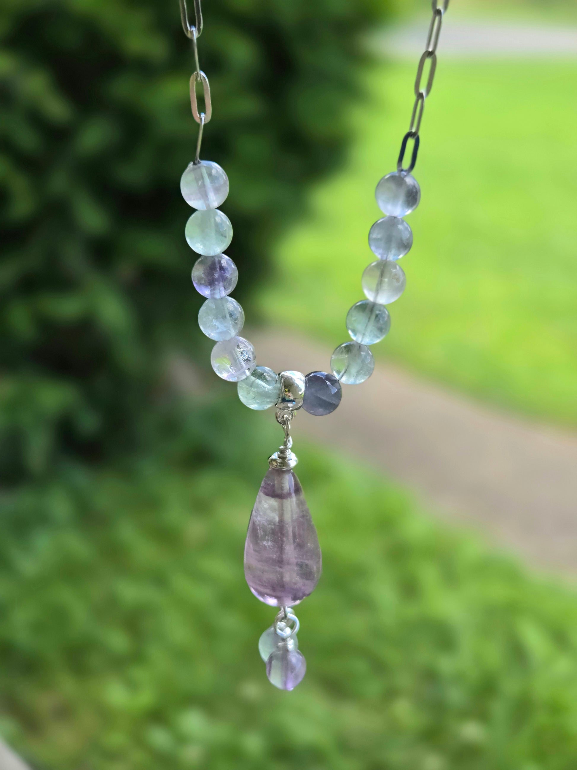 Created with beautiful fluorite gemstone beads, a beautiful teardrop fluorite on a paperclip steel chain with lobster clasp.
