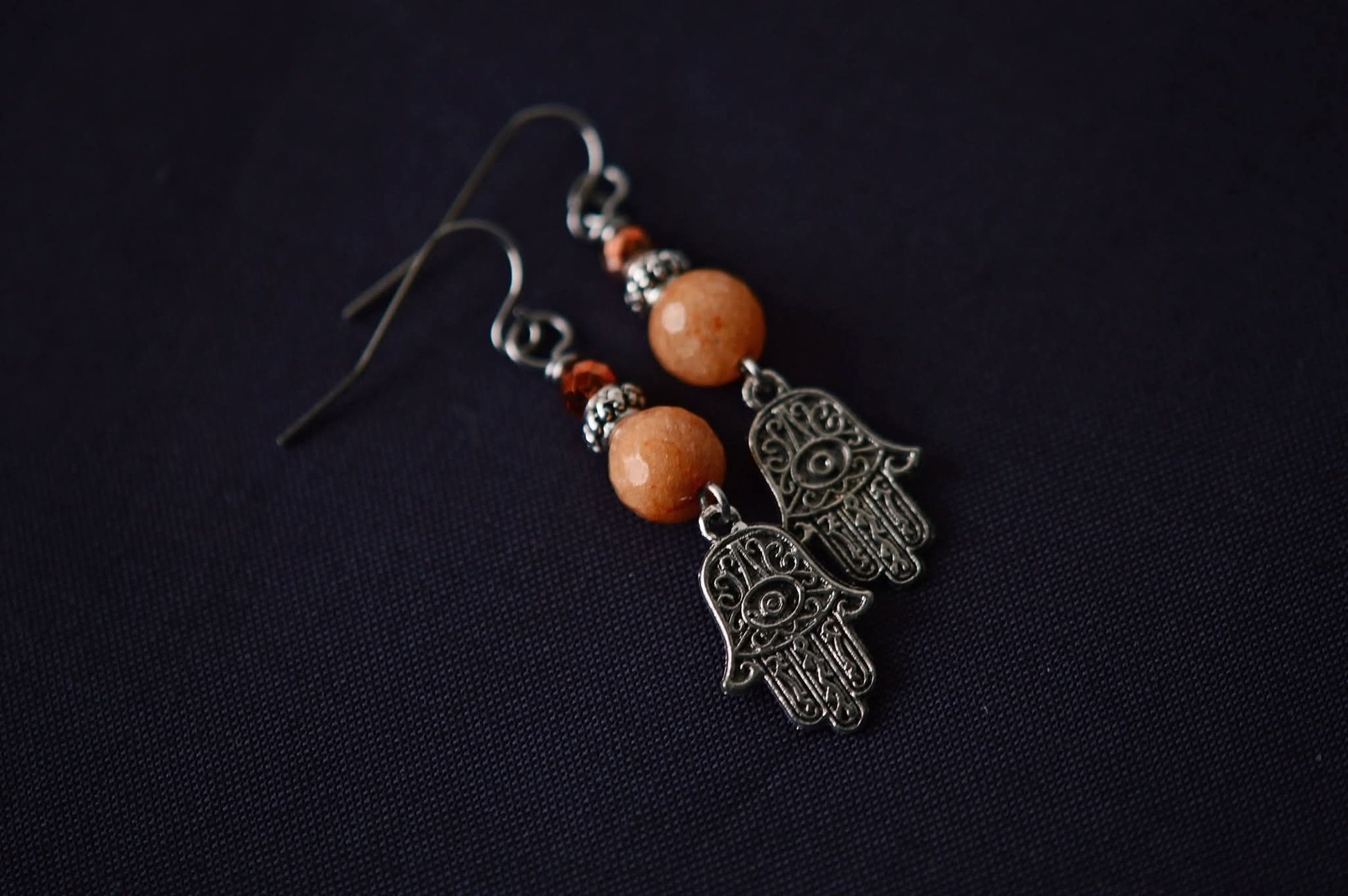 Elevate your style with our Peach Jade Hamsa Earrings. Made with hypoallergenic steel, these earrings are perfect for sensitive skin. The 8mm faceted jade beads and antique silver hamsa drops add a touch of elegance. Make a statement with these 1.75" long earrings.