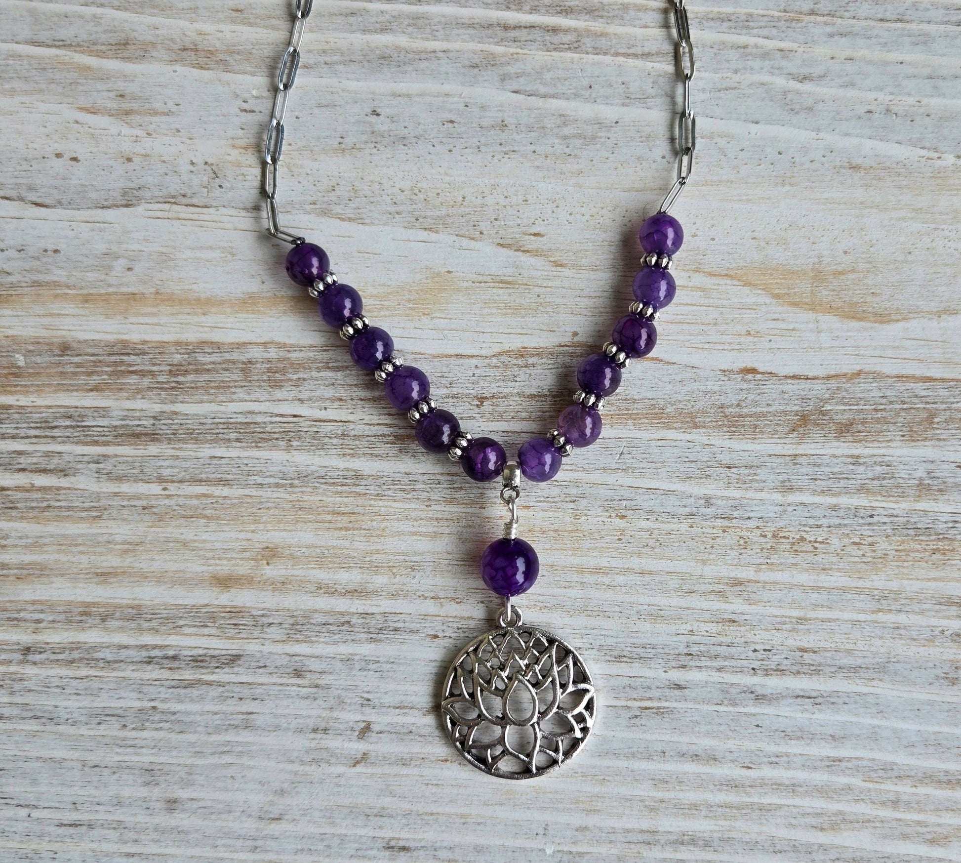 Unlock the power of healing with our Purple Dragons Vein Lotus Healing Necklace. Crafted with care, this necklace boasts stunning purple dragons vein gemstone beads alongside a delicate lotus pendant. Transform your energy and find inner peace with this captivating piece.