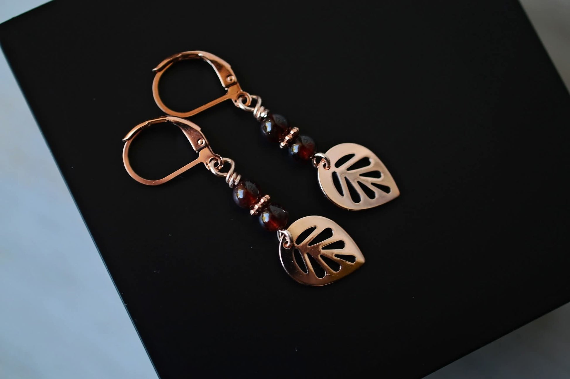 Sangria Garnet Rose Gold Leaf Earrings, Maroon Earrings, Red Earrings, January Birthstone, Healing Jewelry